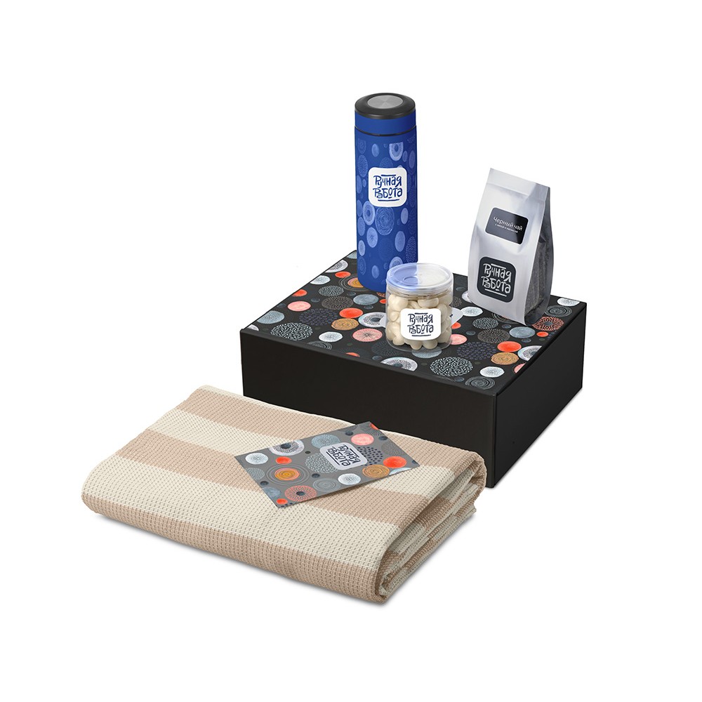 | Материал товара | плед - 100% хлопок, термос - нержавеющая сталь с покрытием софт-тач, чай - пластик, мешок - нетканый материал (спанбонд), коробка - картон |