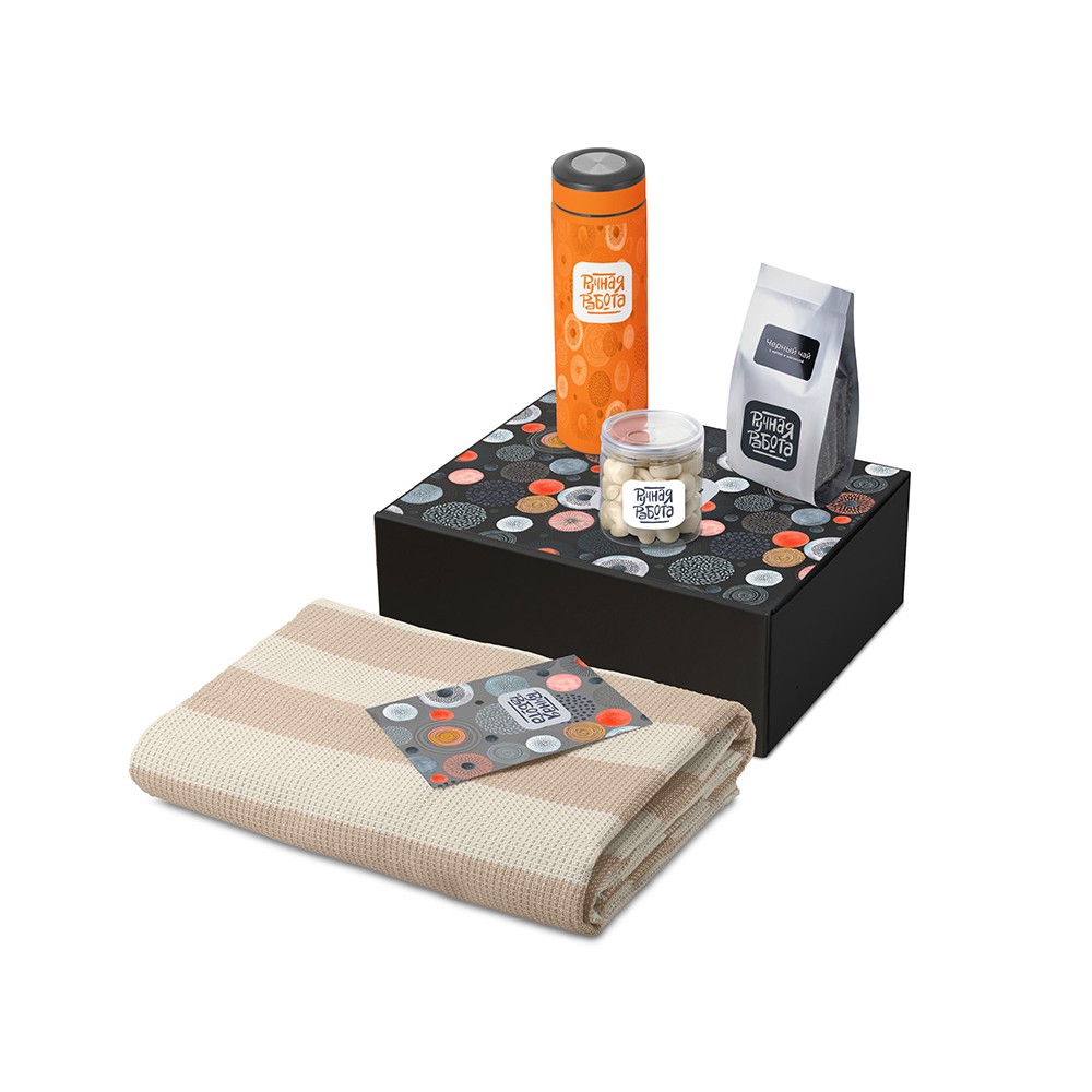 | Материал товара | плед - 100% хлопок, термос - нержавеющая сталь с покрытием софт-тач, чай - пластик, мешок - нетканый материал (спанбонд), коробка - картон |