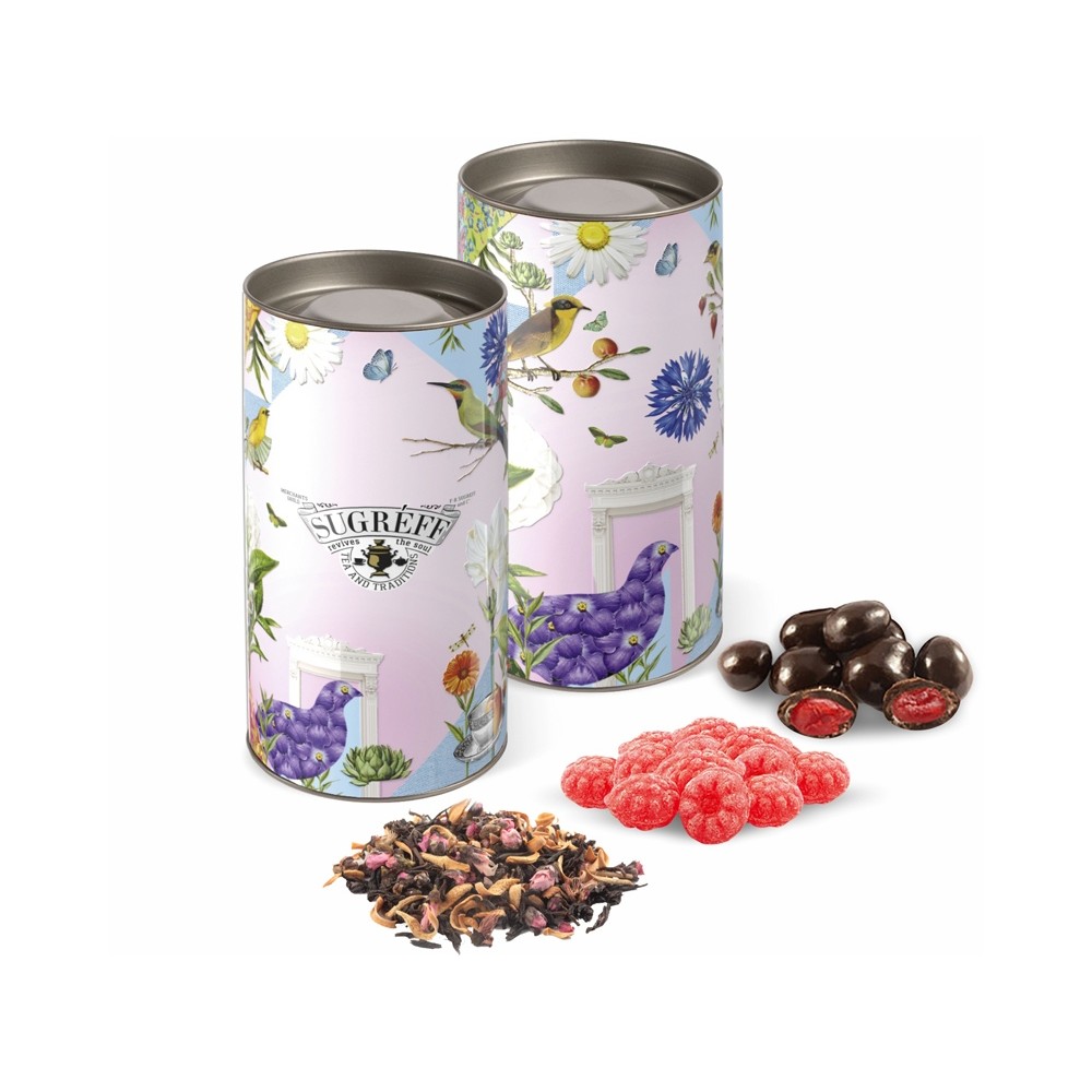 При открытии тубуса вас ждет настоящая гастрономическая сказка. Цветочный чай прекрасно сочетается с леденцами, создавая неповторимый вкусовой букет. А вишня в шоколаде добавляет нотку шарма к каждому леденцу.