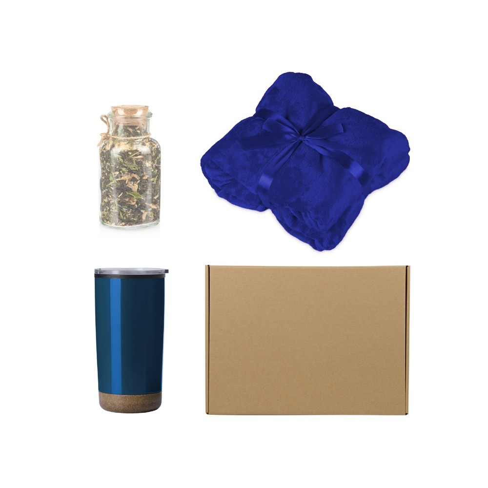Подарочный набор с пледом, термокружкой и чаем, синий