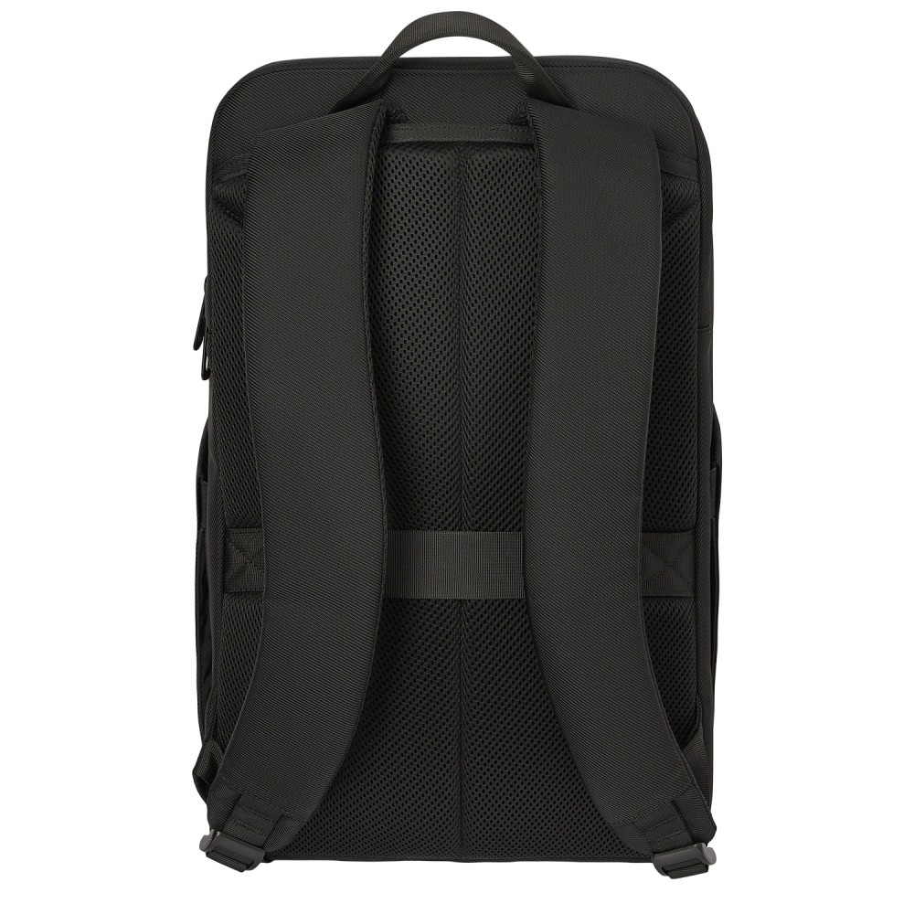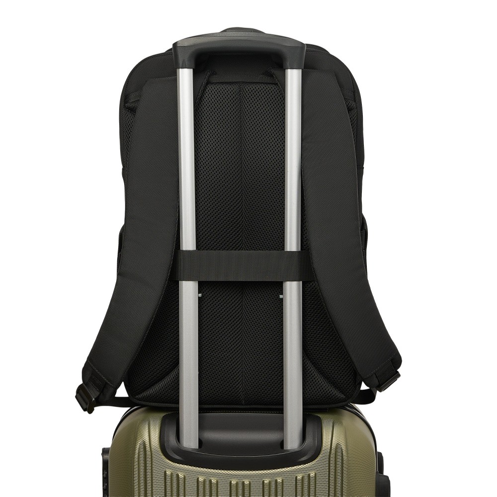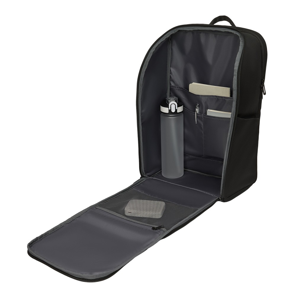 Уплотнённые стенки обеспечивают сохранение формы даже при неполной загрузке и лучшую защиту содержимого (гаджеты, хрупкие предметы). Основная секция раскрывается на 90°, есть отдельная секция для ноутбука. Рюкзак имеет две мягкие регулируемые лямки, два боковых кармана с фиксаторами и багажную ленту на спинке.