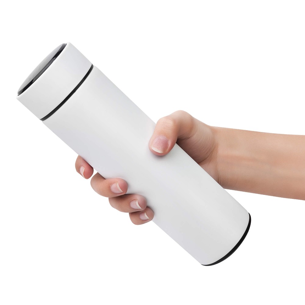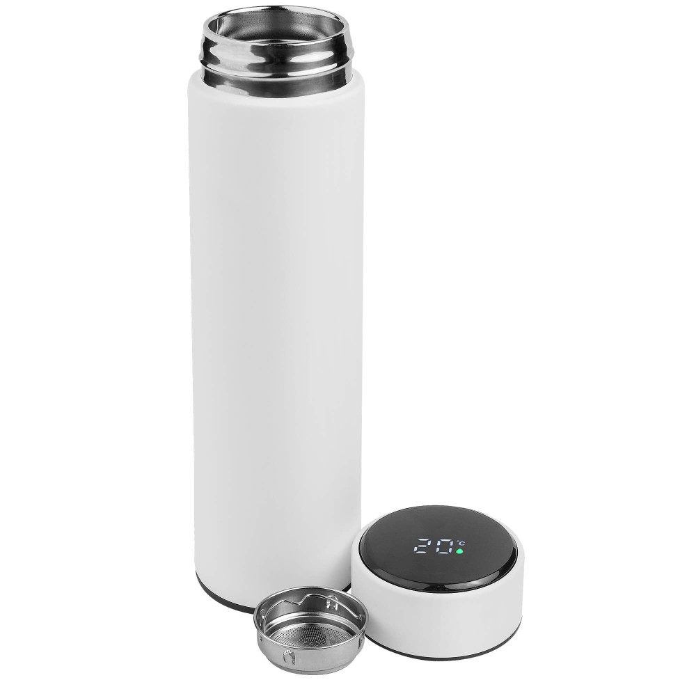 Термос из нержавеющей стали с покрытием soft-touch. Крышка в цвет термоса с покрытием soft-touch.   Внутренняя стенка - нержавеющая сталь  AISI 304;Внешняя стенка - металл с покрытием soft-touch; Благодаря двойным стенкам и вакуумной изоляции, колба способна удерживать тепло на протяжении 18 часов. При температуре окружающей среды ~ +25°С   Термос поставляется в комплекте с ситечком.   На крышке ЖК дисплей с сенсорным индикатором температуры. Чтобы узнать температуру внутри термоса, нужно прикоснуться к поверхности крышки. Батарейку CR2032 можно заменить — для этого открутите верхнюю часть крышки против часовой стрелки и аккуратно поменяйте элемент питания.