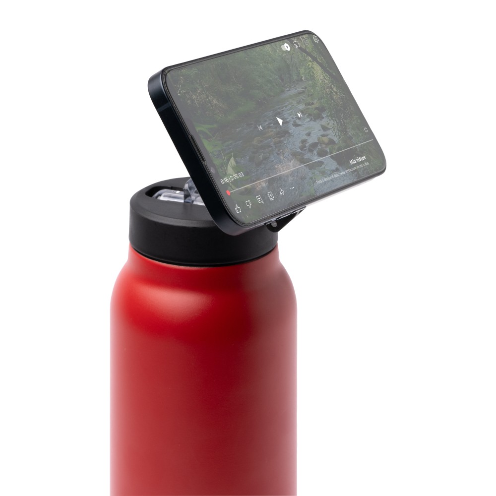 Бутылка-термос из переработанной нержавеющей стали с двойными стенками. Крышка с магнитным кольцом для держателя мобильного телефона. Со складной соломкой и нескользящей резиной на основании. Емкость: 750 мл.