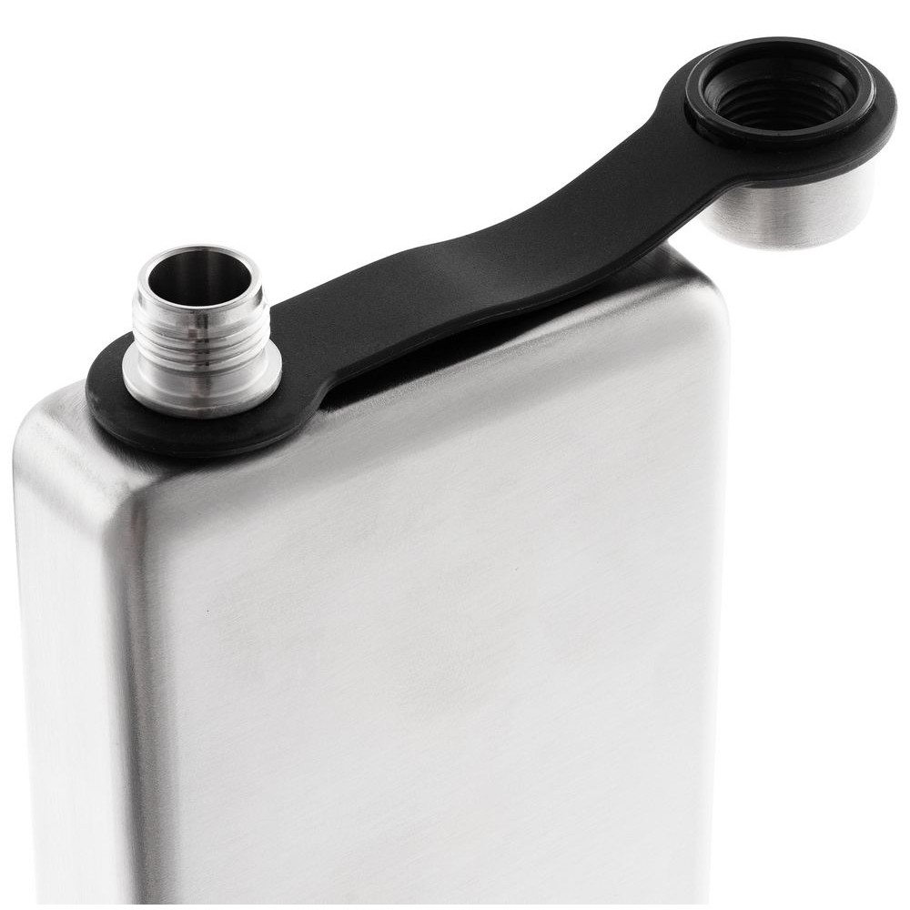 Завинчивающаяся крышка надежно крепится к горлышку ремешком, за который также удобно подвешивать и саму фляжку, например, на рюкзак.