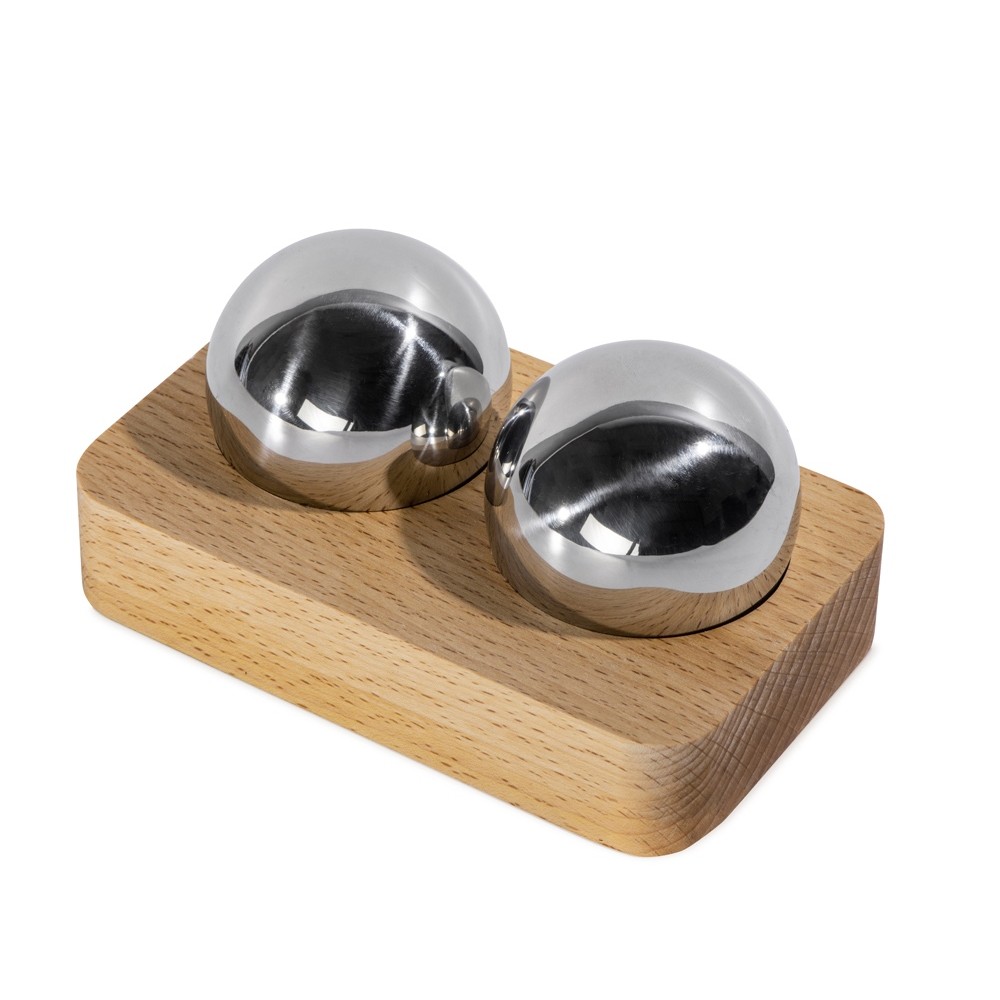 Набор состоит из двух сфер, выполненных из нержавеющей стали, и подставки из дерева, которая позволяет хранить их надлежащим образом и не дает укатываться с полки. Шары изнутри наполнены специальной охлаждающей жидкостью (95% воды +5% глицерина), которая помогает быстрее понизить температуру напитка. Жидкость надежно запаяна, не является токсичной, не просачивается сквозь металл. Нержавеющая пищевая сталь 304 марки, из которой состоит шар, не изменяет вкус, цвет и запах напитков, в том числе и алкогольных, в которые помещено выполненное из этого материала изделие. Сферы для охлаждения виски не только эффектно выглядят, но и весьма полезны, быстро понижая температуру, а главное — не разбавляют напиток в процессе. Перед использованием шары нужно положить в морозильную камеру на несколько часов (от трех до шести), а затем поместить в бокал для виски. Готово! Подставка не только обрамляет основной компонент набора, подавая его и дополняя, но и решает важный вопрос хранения шаров, не давая им укатываться. - просты в использовании - многочисленные возможности для персонализации - материалы высокого качества, безопасные для человека - интересный формфактор Для продления жизни подставки ее можно смазывать растительным, оливковым, льняным маслом. Не замачивать в воде, не пересушивать. На время пропитки шары следует извлечь из выемок.