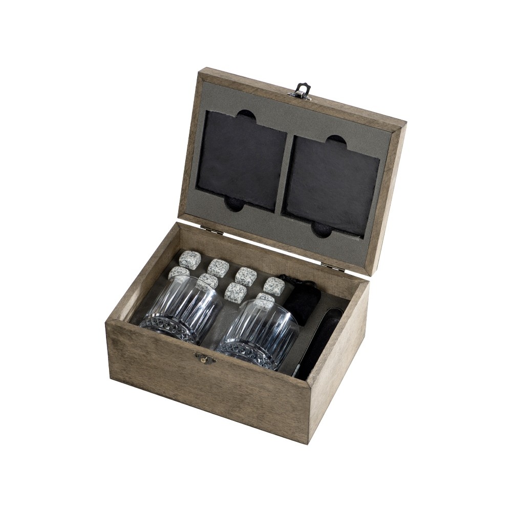 Набор для виски Jack состоит из двух стаканов с толстым дном, охлаждающих камней в мешочке, удобных щипцов и двух лаконичных костеров из сланцевого камня. Сет упакован в деревянную подарочную шкатулку, которая создает праздничное настроение еще до того, как вы откроете крышку. Более того, это уже готовый набор для подарка.