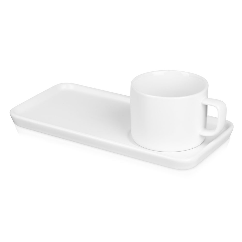 Чайная пара с необычным прямоугольным блюдцем — на нем хватит места не только для чашки, но и для пирожного. Весь силуэт этого комплекта — лаконичный, строгий, прямоугольный, что создает прекрасный фон для нанесения логотипа. Удобство этой чайной пары еще и в том, что для чашки предусмотрена отдельная ниша, которая не даст ей соскользнуть. - большое блюдце необычной формы с местом для чайного пакетика или печенья - кружка белая с двух сторон - удобная ручка - костяной фарфор