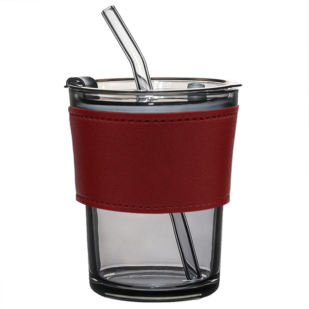 Стакан стеклянный с трубочкой и капхолдером Karamel, бордовый