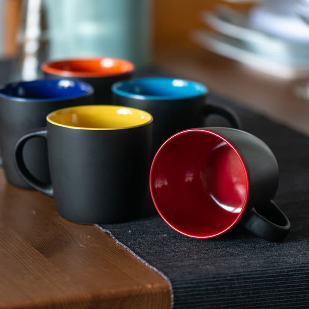 Оригинальная керамическая кружка INTRO объёмом в 350 мл с матовым черным покрытием и яркой цветной внутренней частью будет смотреться эффектно и выразительно на любой поверхности и в любом интерьере.