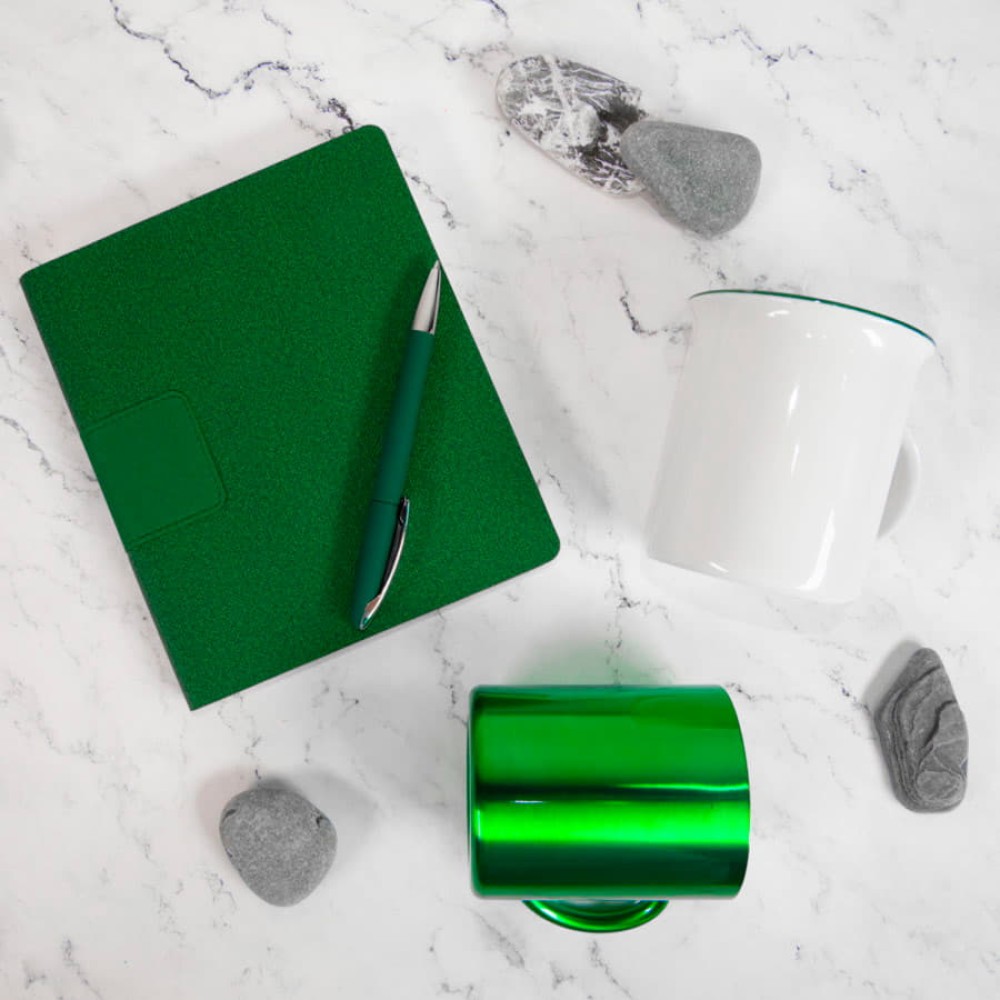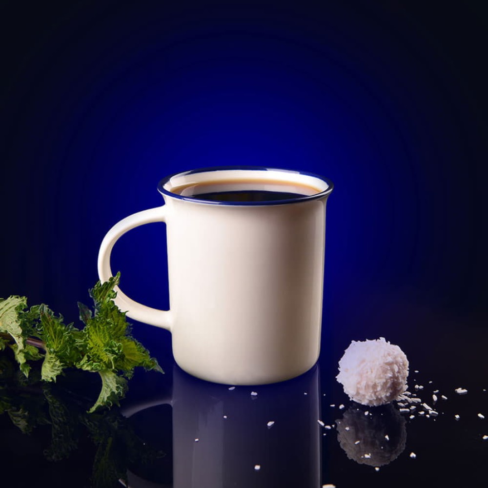 Белое глянцевое покрытие дополняет цветной кант по краю кружки.