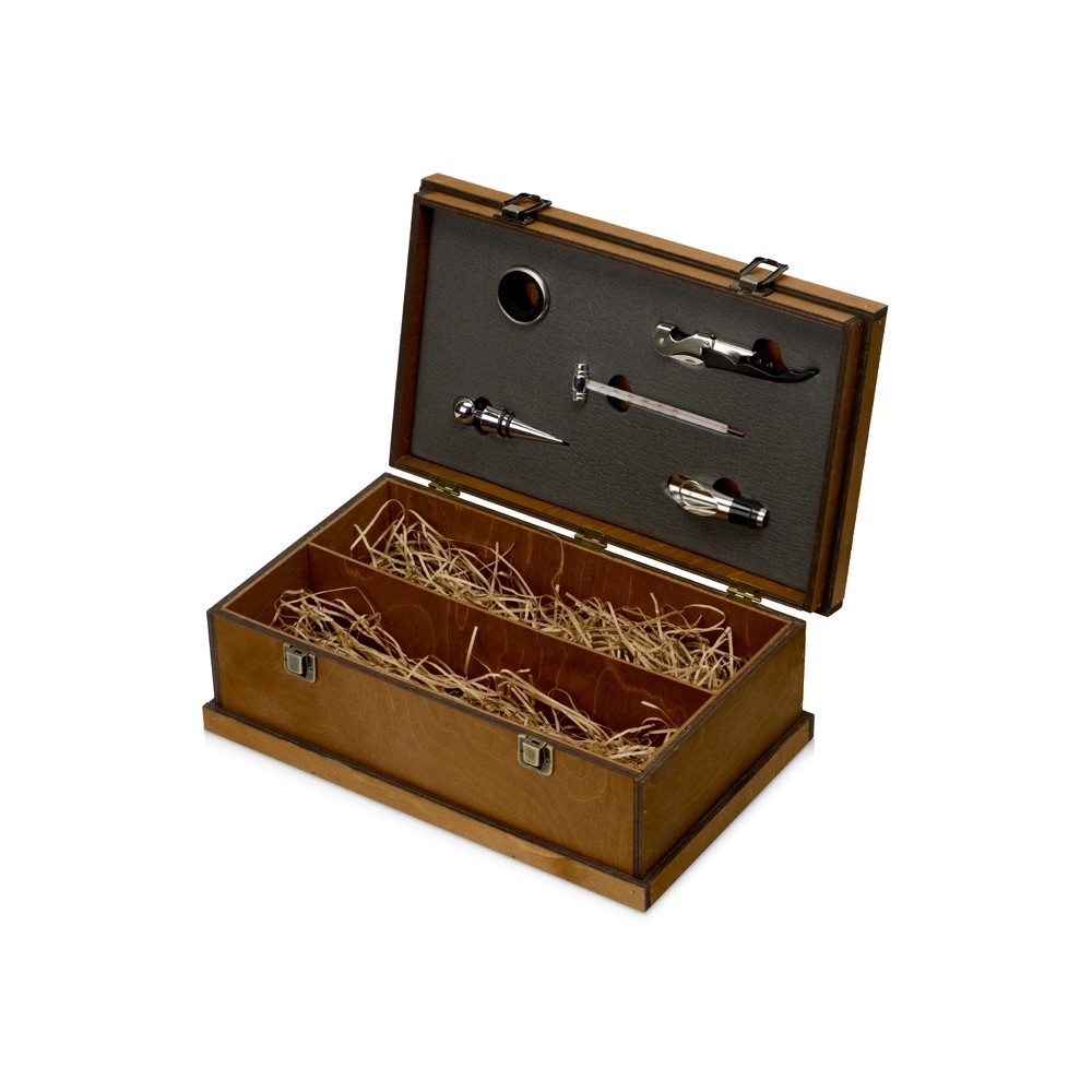Эксклюзивный набор аксессуаров для вина, будет отличным имиджевым подарком. В комплект входят: штопор-открывалка, воротничок на бутылку, пробка, термометр, воронка-аэратор. Аксессуары упакованы в стильный деревянный сундучок-кейс с деревянной стружкой и отделкой из искусственной кожи для двух бутылок. Роскошный подарок по любому поводу.