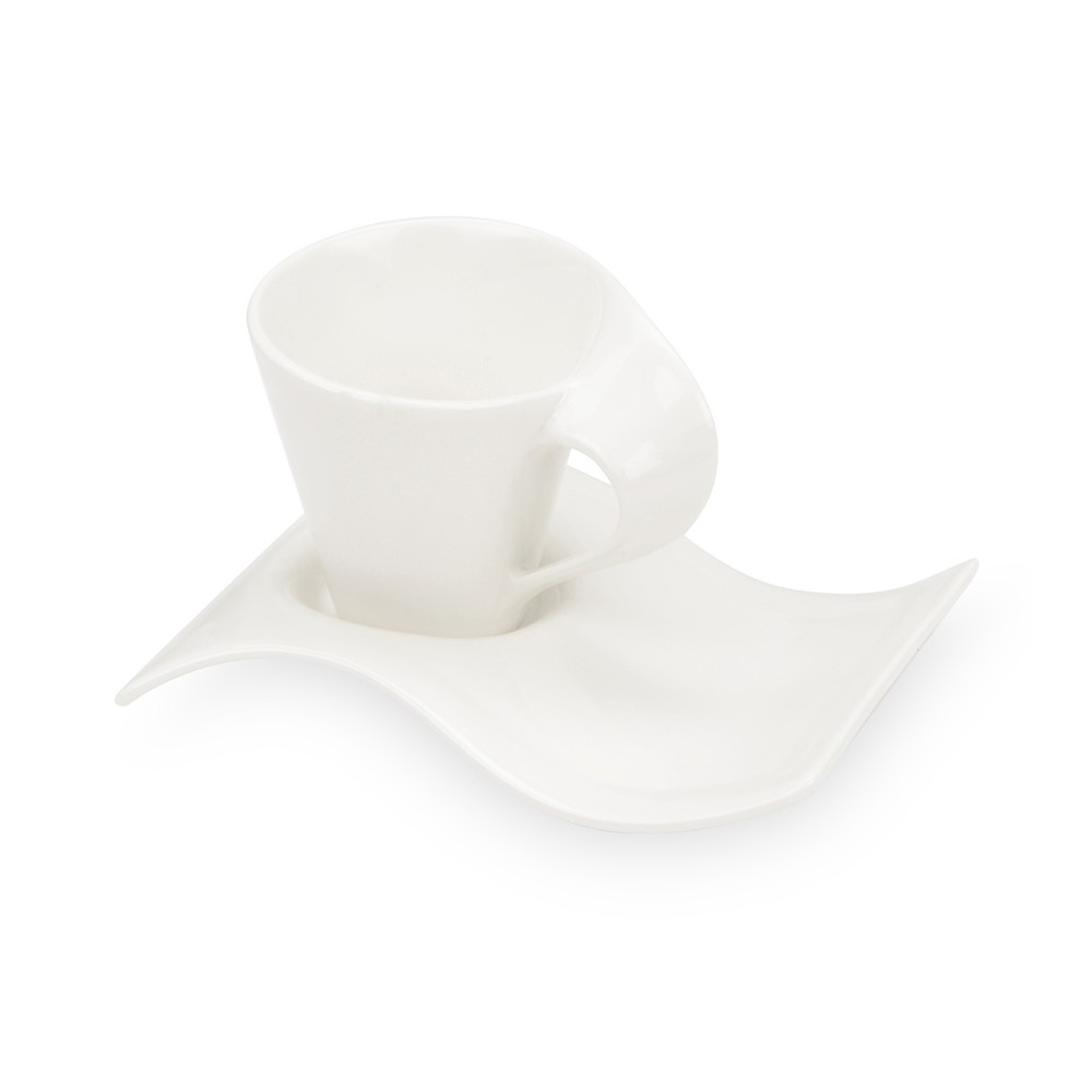 Элегантная кофейная пара, состоящая из чашки на 110 мл и блюдца, обладает грациозными формами и необычным дизайном. Фарфор цвета слоновой кости и смелость линий придутся по вкусу утонченным дамам.