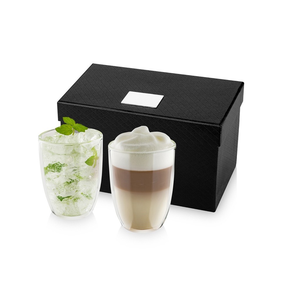 Набор Boda из 2-х предметов. Набор из двух стаканов 300 мл с двойными стенками. Идеальны для подачи кофе латте макьято, холодного чая или других горячих или холодных напитков. Упакован в подарочную коробку. Шильд для лого в комплекте. Стекло.