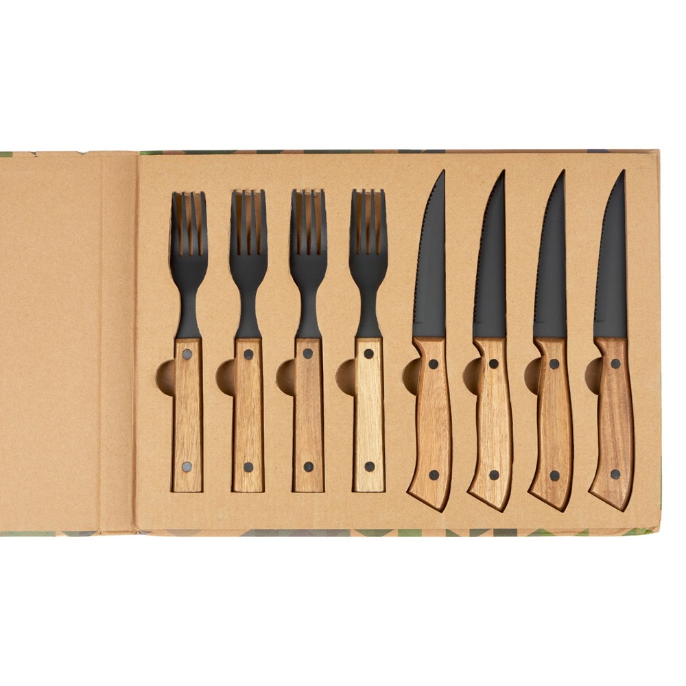 | Вес391 | Комплектностьнож для стейка 22,5 x 2,7 см - 4шт, вилка для стейка 20 x 2,7 см - 4шт | Материал товаранержавеющая сталь, дерево |