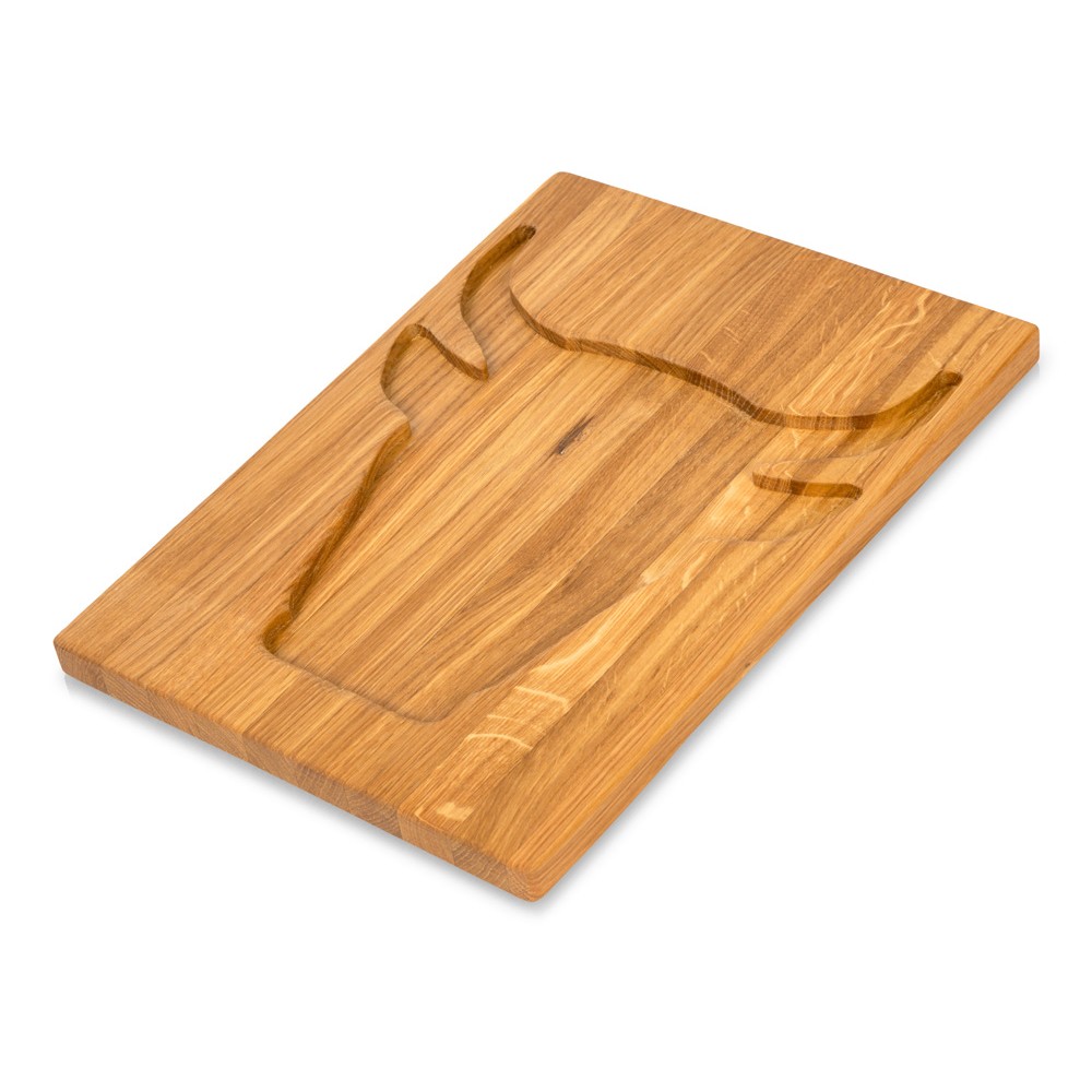 На одной из сторон имеется углубление в форме головы быка, благодаря которому сок из стейка не прольётся на стол.