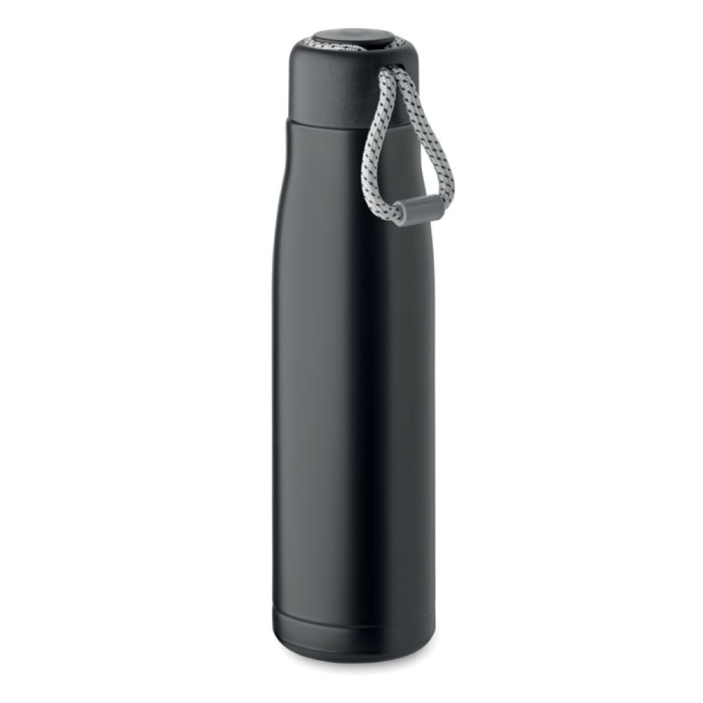 Термос с двойными стенками из 90% переработанной нержавеющей стали и 10% нержавеющей стали со шнурком-держателем на крышке из полипропилена. Герметичен. Объем: 500 мл.