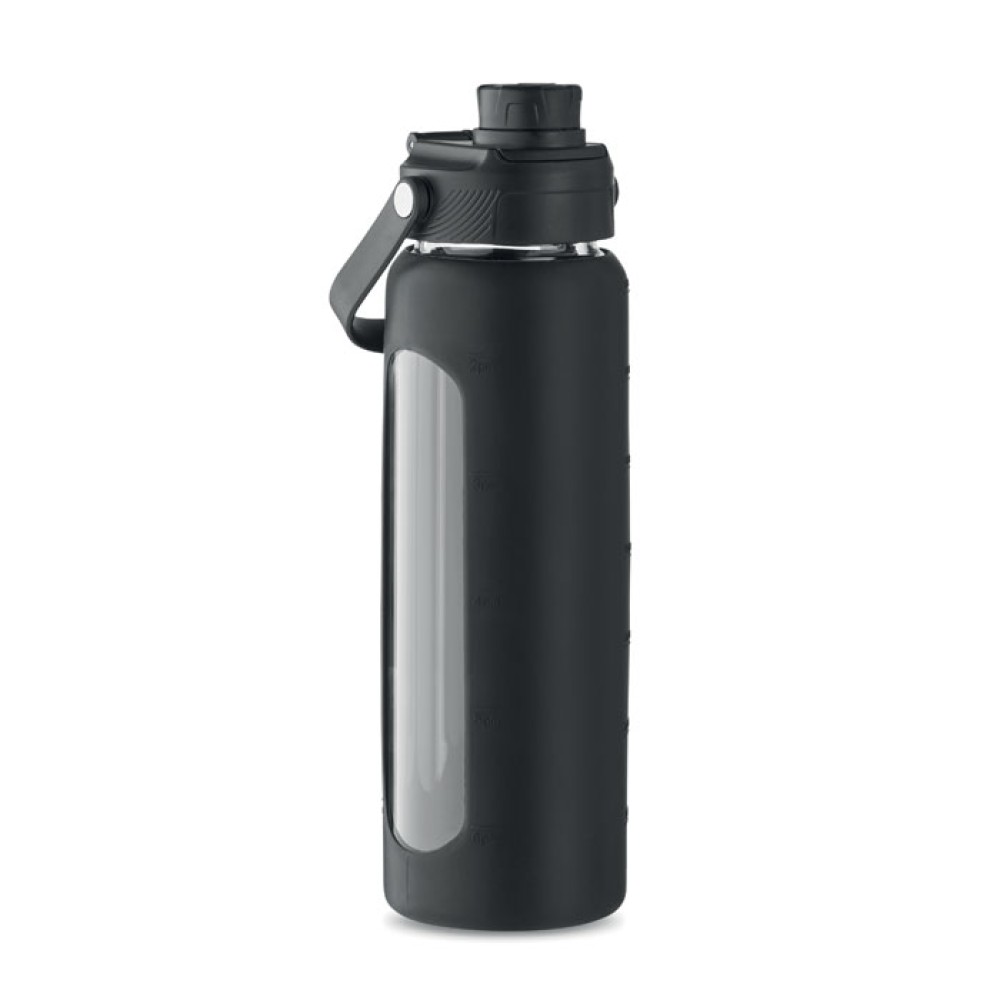 Бутылка из боросиликатного стекла с силиконовой прозрачной вставкой и полипропиленовой крышкой с ручкой для переноски. Герметична. Емкость: 750 мл.
