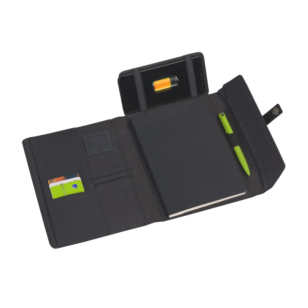 Папка А5 с беспроводным зарядным устройством 4000 mAh и блокнотом softtouch, черный