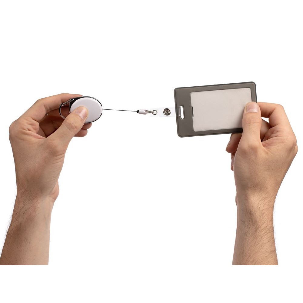 Ретрактор крепится к одежде с помощью карабина, а с другой стороны можно поместить бейдж, визитку или магнитную карту. В корпусе спрятан сворачивающийся шнур, который позволяет при необходимости демонстрировать содержимое держателя, не снимая его.