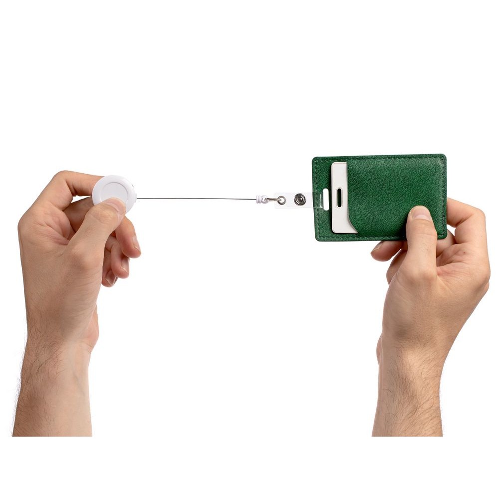 Ретрактор крепится к одежде, а с другой стороны можно поместить бейдж, визитку или магнитную карту. В корпусе спрятан сворачивающийся шнур, который позволяет при необходимости демонстрировать содержимое держателя, не снимая его.