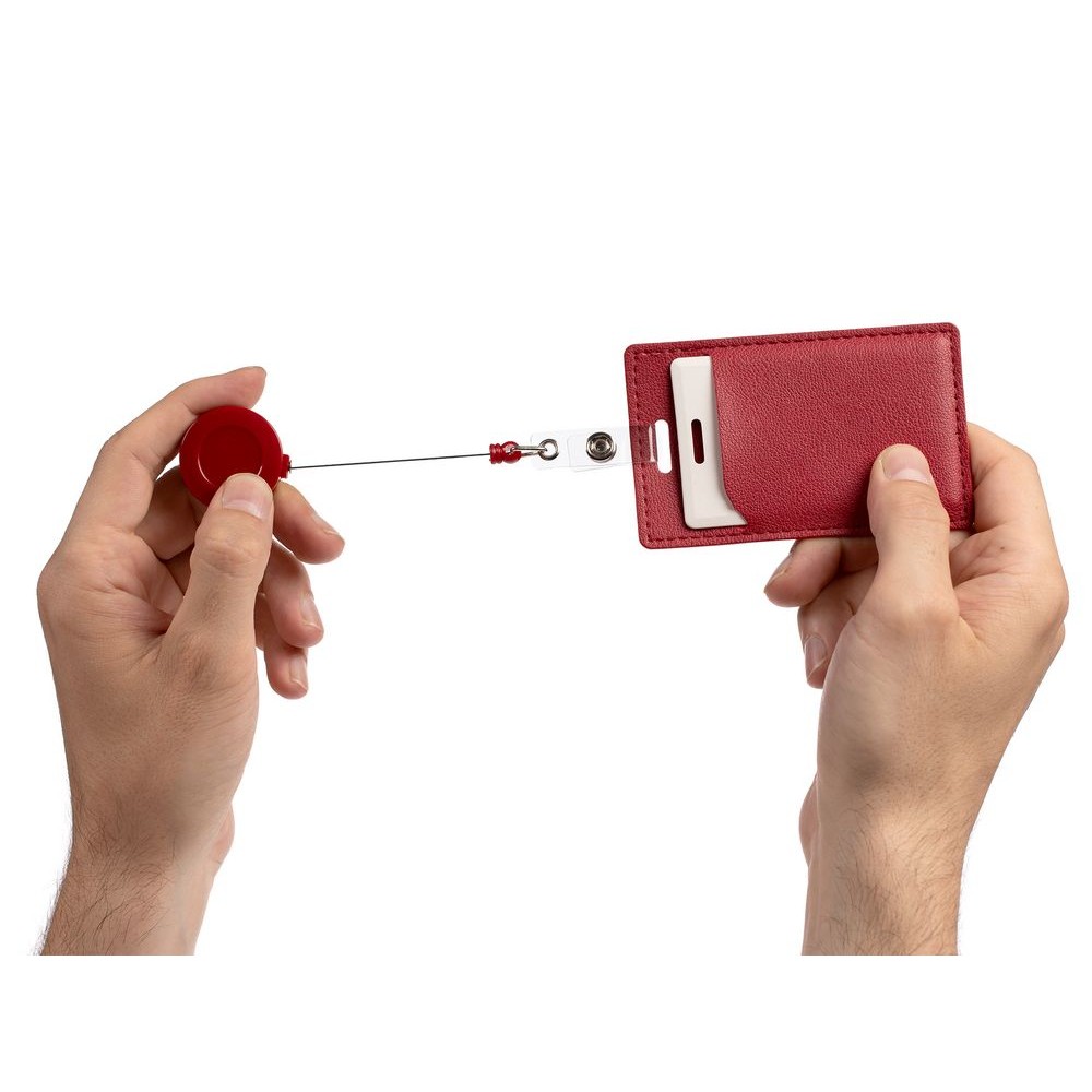 Ретрактор крепится к одежде, а с другой стороны можно поместить бейдж, визитку или магнитную карту. В корпусе спрятан сворачивающийся шнур, который позволяет при необходимости демонстрировать содержимое держателя, не снимая его.