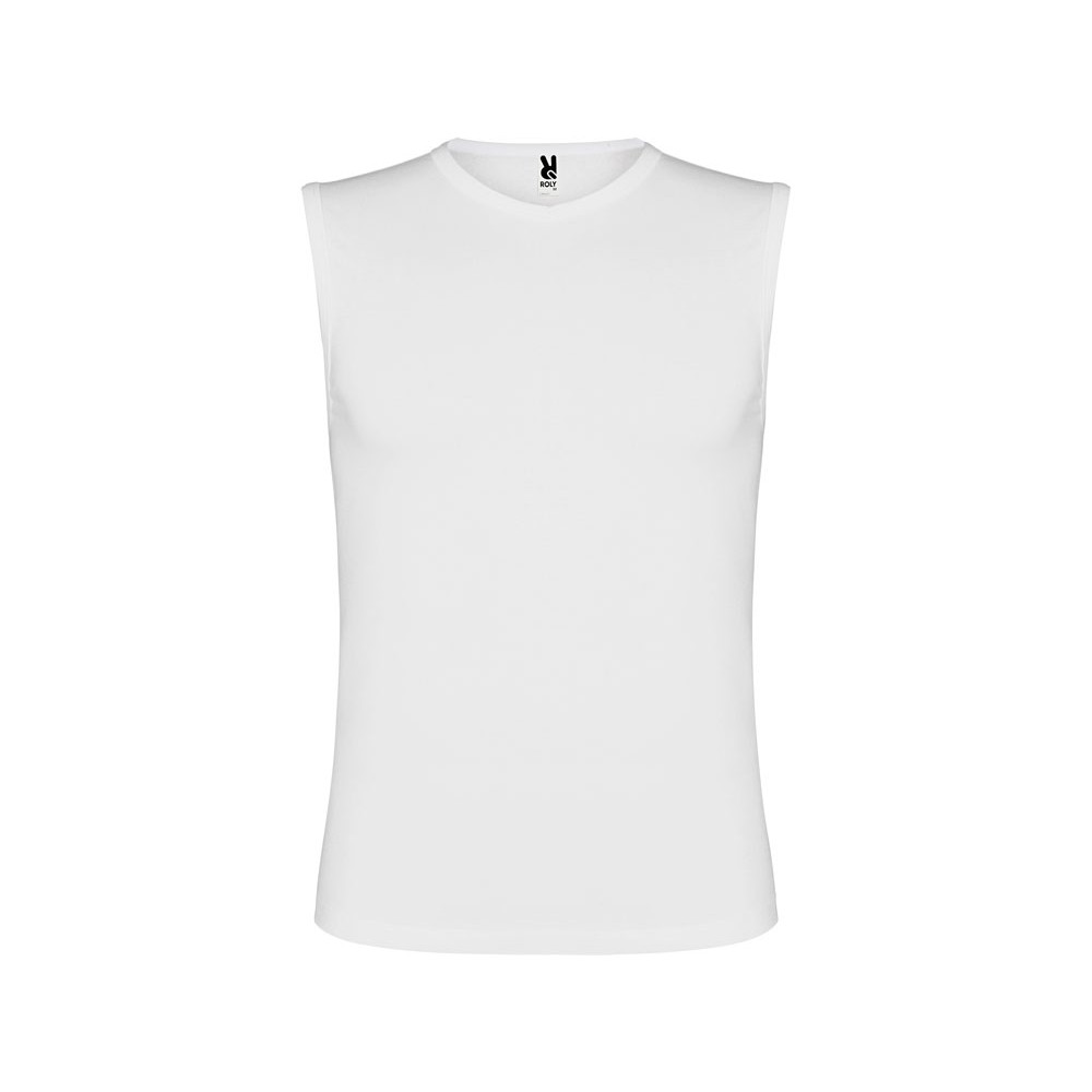 Мужская майка узкого силуэта с V-образным вырезом горловины. Отделка рибом по горловине и пройме.