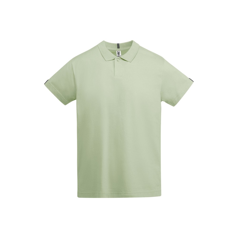 Рубашка поло с коротким рукавом из однотонного трикотажа. Воротник в рубчик 1x1. Разрез с застежкой на 1 пуговицу. Усиленные закрытые швы в воротнике. Боковые разрезы на подоле. Контрастная тесьма в елочку по низу рукава и на воротнике. Логотип Roly внутри.