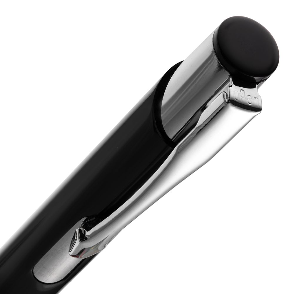 Яркая шариковая ручка с глянцевым цветным корпусом и хромированными деталями.