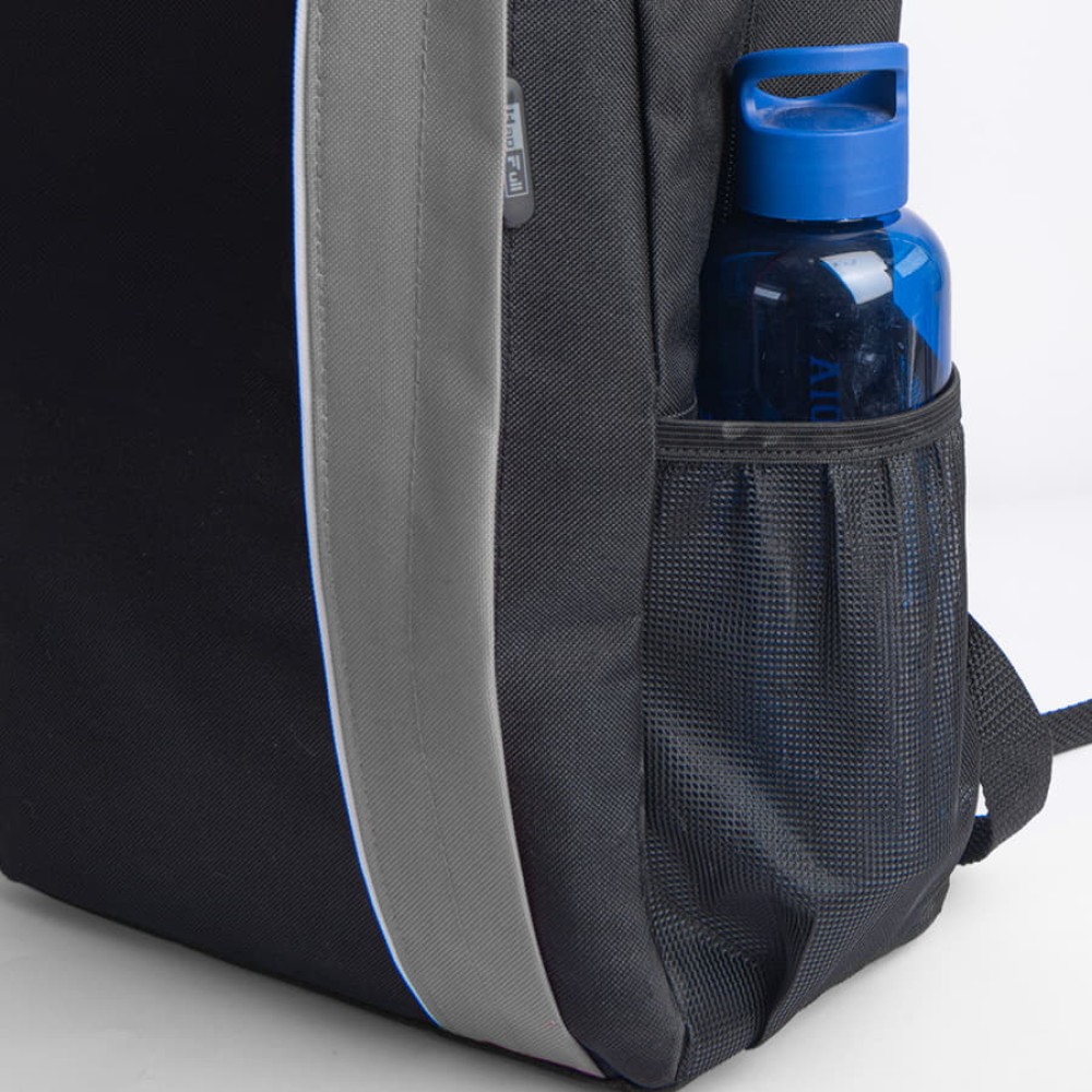Рюкзак выполнен из 100% полиэстера 600 D. Одно основное отделение, два боковых сетчатых кармана для бутылок. Одно внутреннее отделение для компьютера, один передний карман на молнии, мягкая задняя панель. Светоотражающие детали.