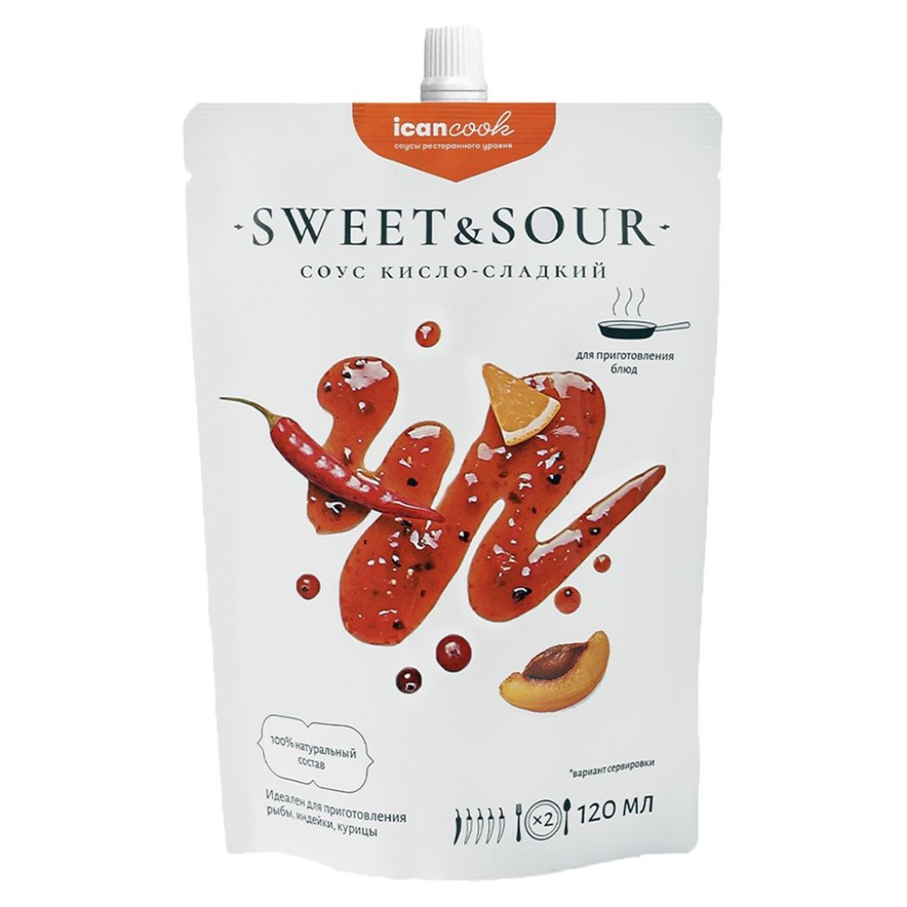 Кисло-сладкий соус Icancook создан только из натуральных ингредиентов — сладость достигается за счет использования спелых абрикосов и томатов без использования рафинированного сахара, а кислинка получается благодаря апельсиновому соку, при этом идеально сбалансированная кисло-сладость придает готовому блюду особенный насыщенный вкус.