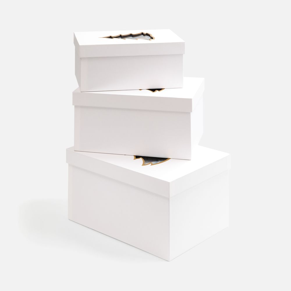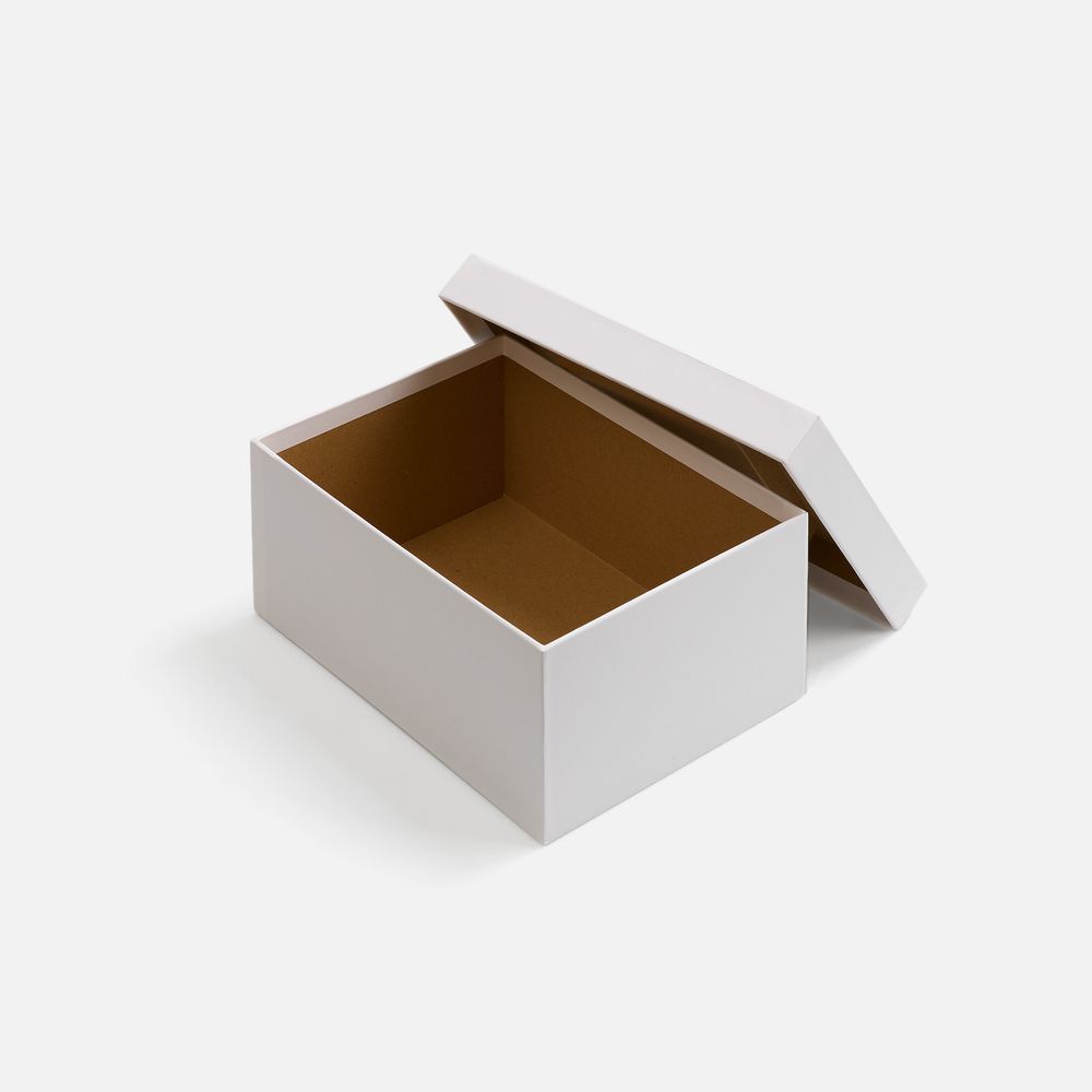 Коробка из переплетного картона, кашированного белой дизайнерской бумагой.