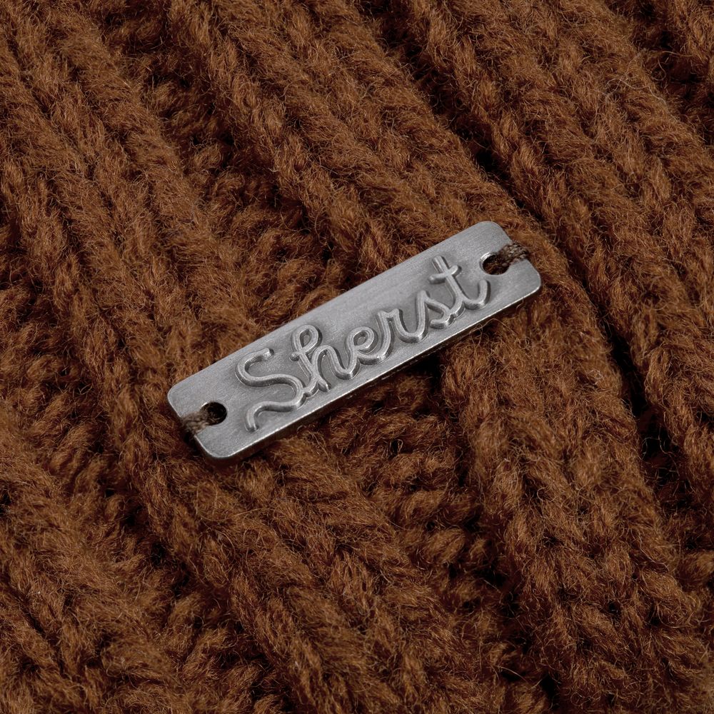 Металлический шильд с названием бренда расположен у заднего шва шапки. Это оставляет место спереди для пришива лейбла или шильдика с логотипом заказчика.