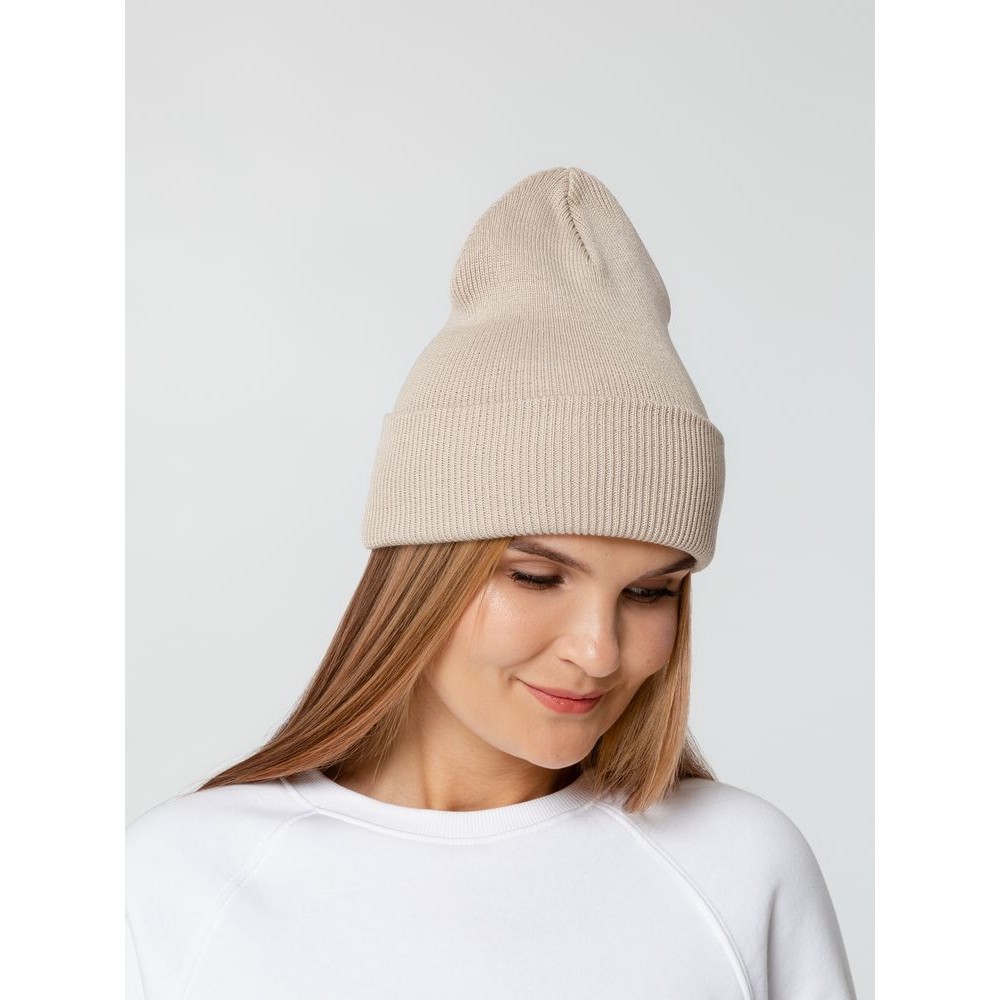 Двухслойная шапка, связанная резинкой, с широким отворотом.
