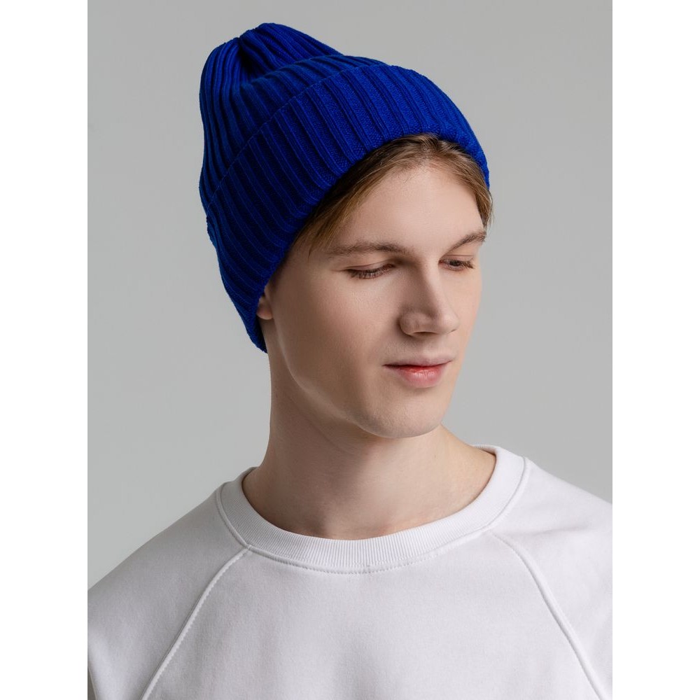 Однослойная шапка фактурной вязки с двойным отворотом.