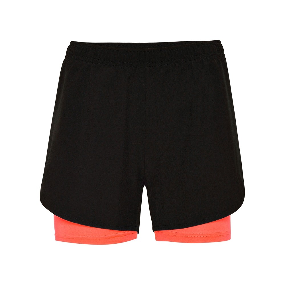 Женские спортивные шорты с контрастными внутренними короткими легинсами. Эластичный пояс с внутренним шнурком для регулировки. Светоотражающие детали. Специальная эластичная ткань для бега.