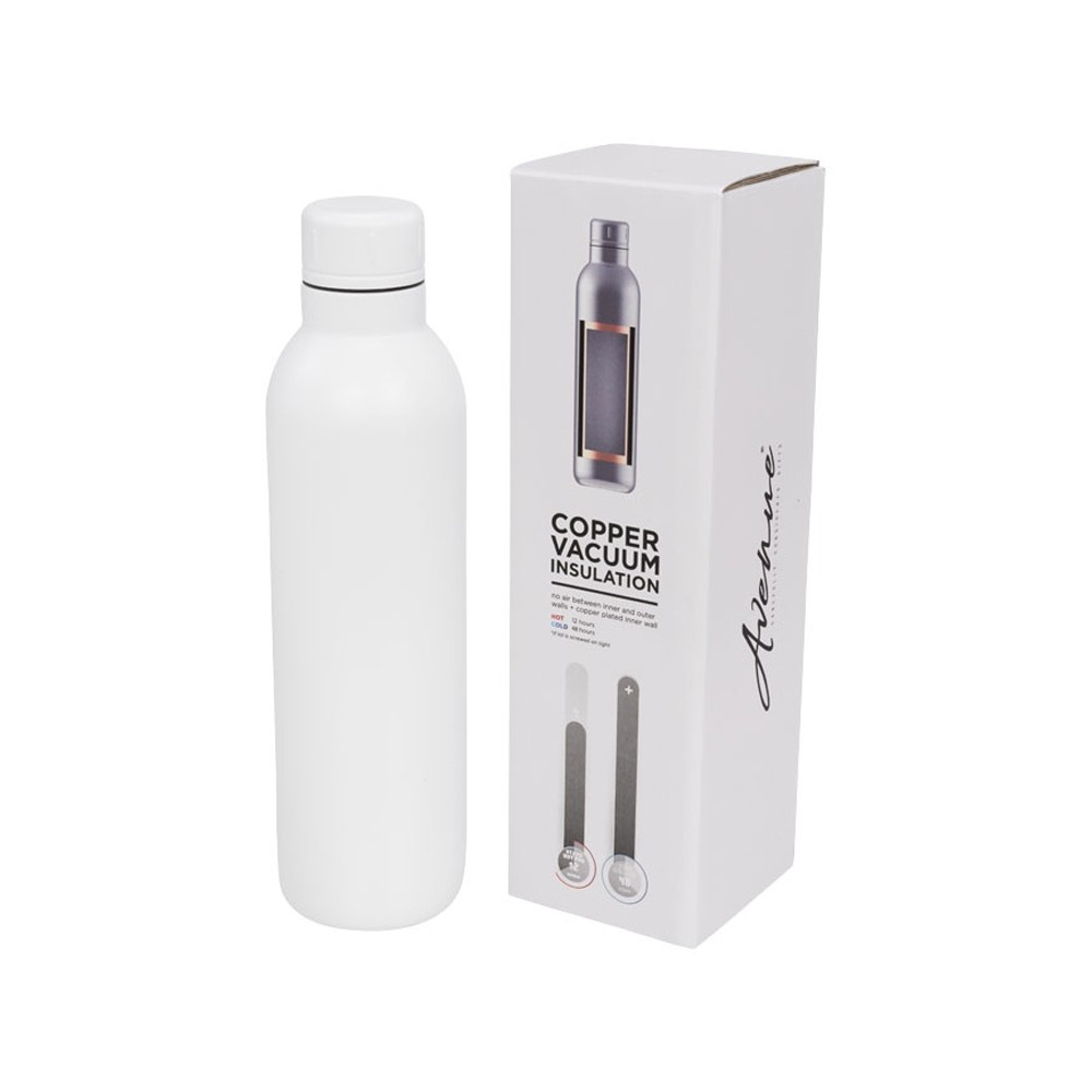 Спортивная бутылка Thor с вакуумной изоляцией объемом 510 мл. Прочная бутылка с двойными стенками из нержавеющей стали и вакуумной медной изоляцией сохраняет напитки холодными в течение 48 часов и горячими в течение не менее 12 часов. Конструкция бутылки предотвращает образование конденсата на внешней стороне. Модное, прочное порошковое покрытие. Герметичная завинчивающаяся крышка из нержавеющей стали. Объем – 510 мл. Предлагается в подарочной коробке Avenue. Нержавеющая сталь.