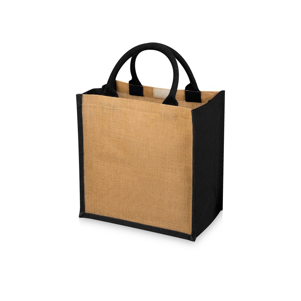 Джутовая подарочная сумка Chennai. Джутовая сумка с ламинированным открытым основным отделением и вставкой. Хлопковые ручки высотой 11,5 см. Джут.