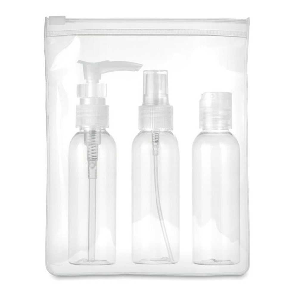 Дорожный набор из 3 флаконов из полипропилена. Представлен в прозрачной косметичке из PEVA. Емкость каждого флакона 60 мл.