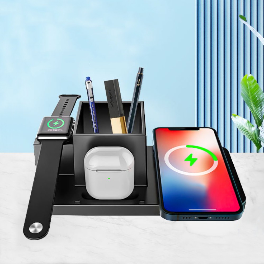 Настольный органайзер Medow предлагает три области для зарядки аксессуаров, а также удобную подставку для канцелярских принадлежностей. Это делает его идеальным помощником для организации рабочего процесса