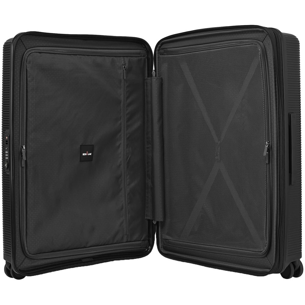 - Чемодан с 2 отделениями: одно из них с фиксирующими ремнями и сетчатым разделителем, второе — с разделителем и карманом-органайзер на молнии