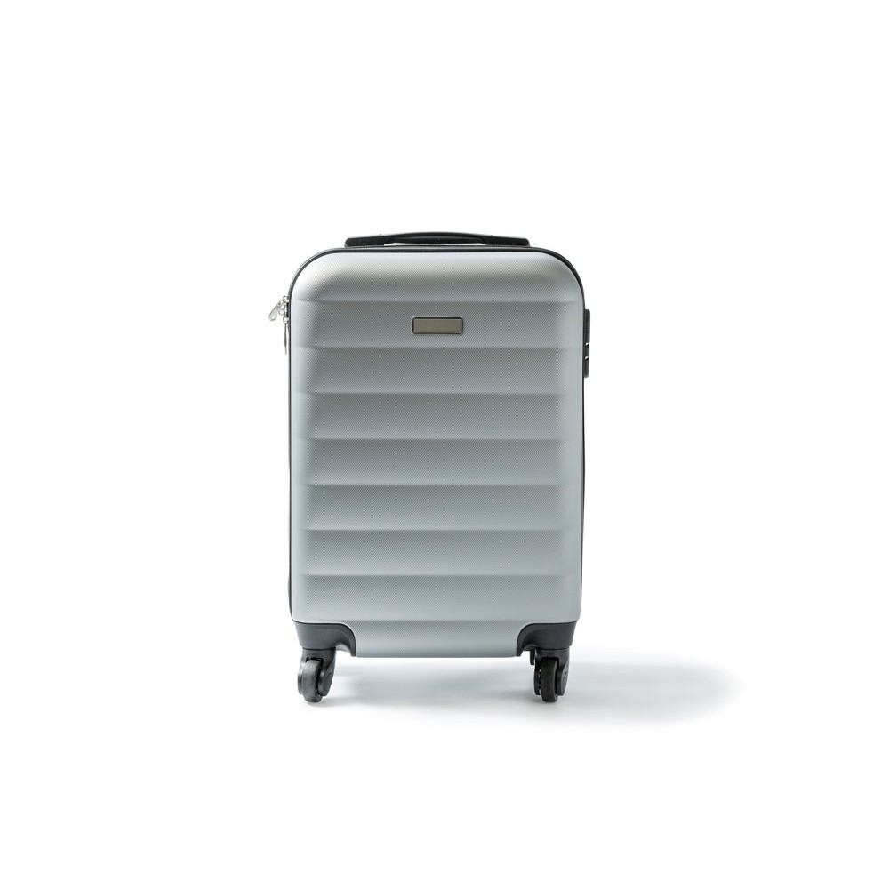 Чемодан из прочного АБС-пластика. Внутри два основных отделения и дополнительный сетчатый карман. Включает встроенный замок безопасности.