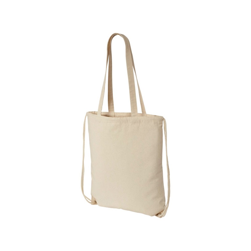 Многофункциональный хлопчатобумажный мешок с длинными ручками и затягивающим шнурком, который можно носить в качестве сумки для покупок или рюкзака. Большой основной отсек, закрывающийся затяжкой шнурка. Имеет две выпадающие ручки длиной 31 см. Вместимость: 16 л, выдерживает до 5 кг веса. Хлопок, 240 g/m2.