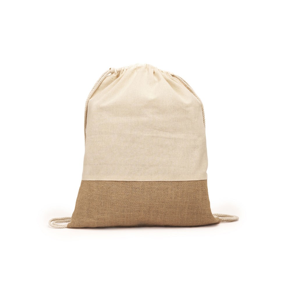 Рюкзак-мешок Eco line из хлопка и джута плотностью 120 г/м². Натуральный цвет. Спереди рюкзак имеет джутовую ленту на нижней части.