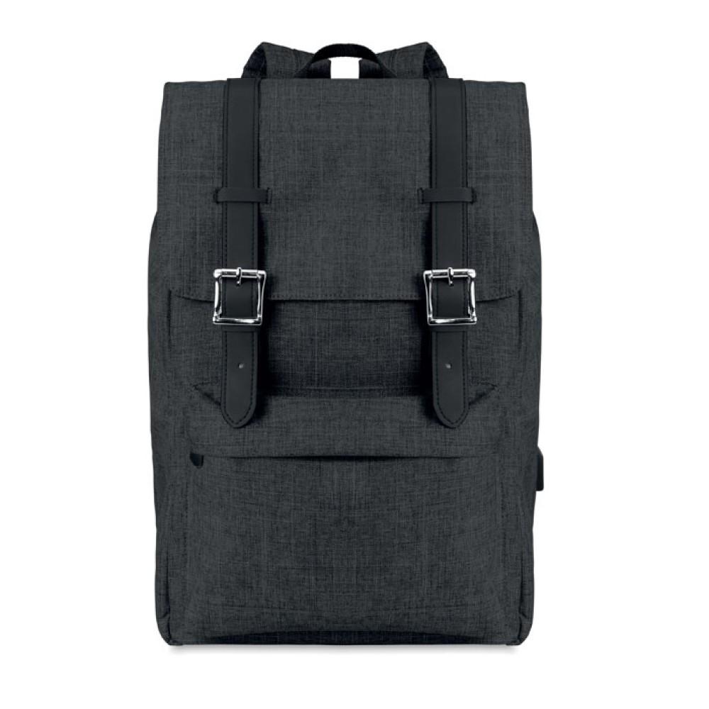 Рюкзак из полиэстера 600D с мягкими шлейками. Внутри 1 отделение для 15-дюймового ноутбука и USB-кабель для зарядки. Декоративные ремни закрываются на магните. Фронтальный карман на молнии.