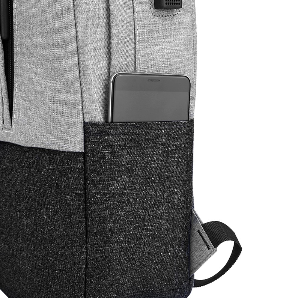 На передней стенке два кармана карман на скрытых молниях. Сбоку два открытых кармана и USB-разъем с проводом для подключения внешнего аккумулятора.