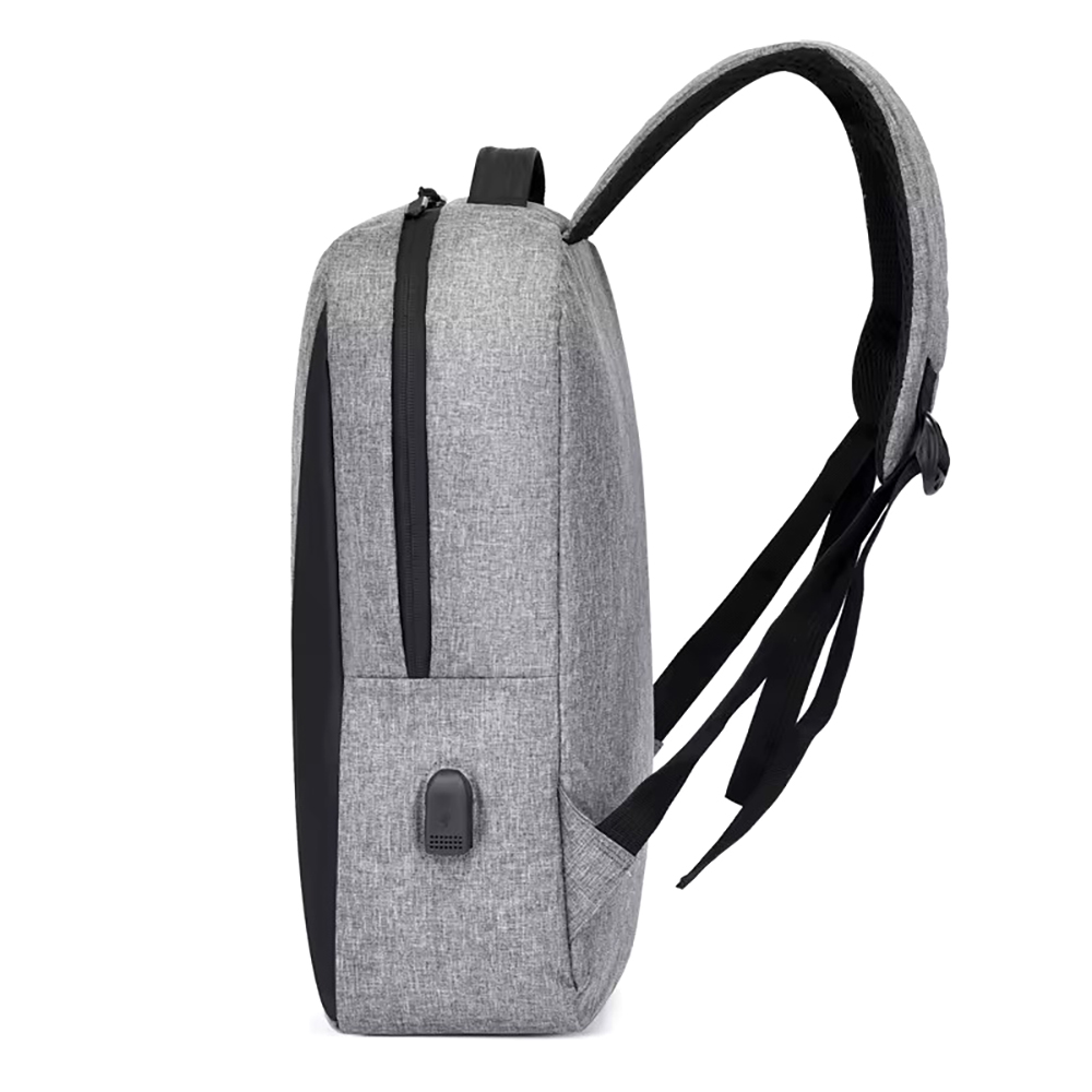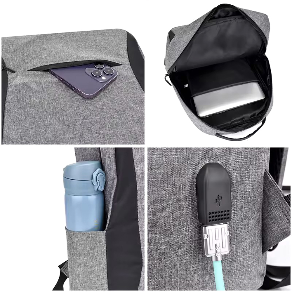 Снаружи карман на молнии на передней стенке, открытый боковой карман и USB-разъем с проводом для подключения внешнего аккумулятора.