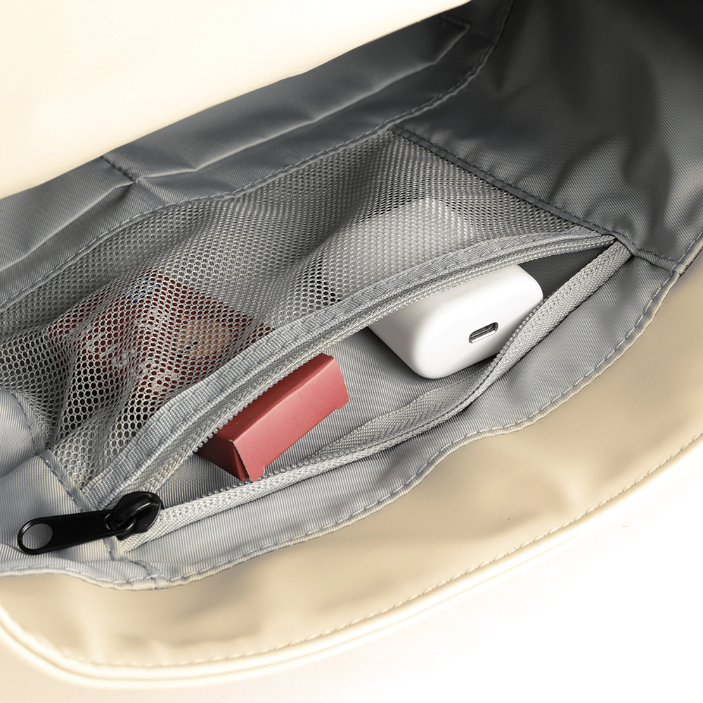 Внутри уплотнённый карман для ноутбука 14 дюймов, карман-органайзер для аксессуаров и ЭКСКЛЮЗИВНАЯ ОПЦИЯ - специальный карман-сетка ДЛЯ АРОМАСАШЕ на молнии.