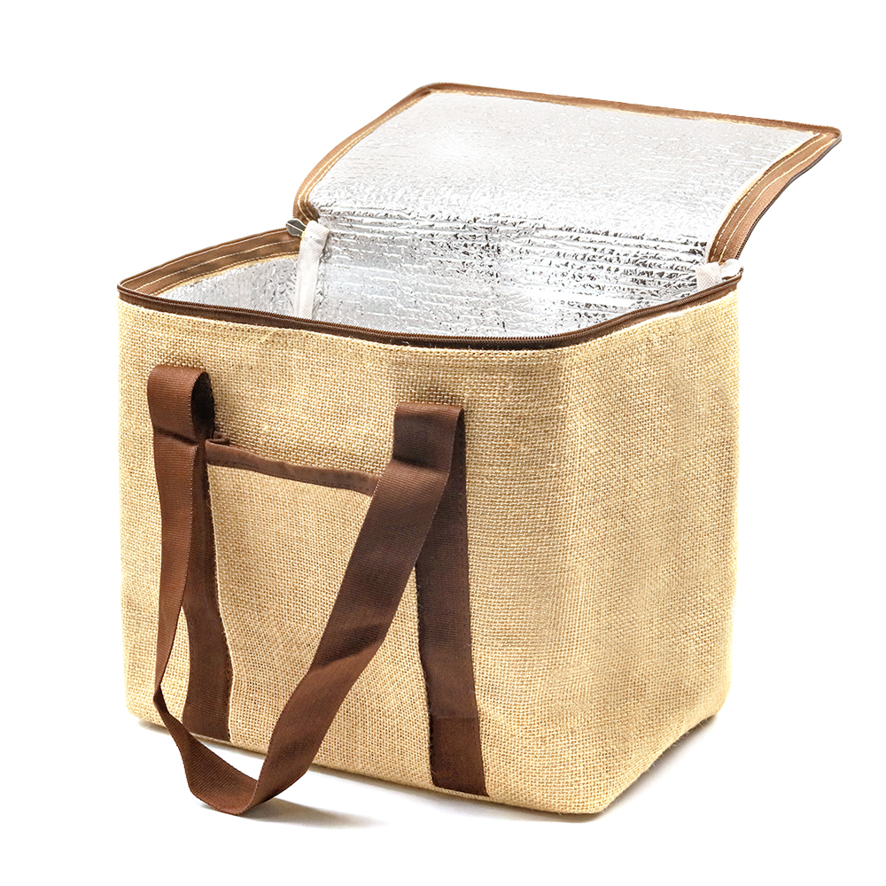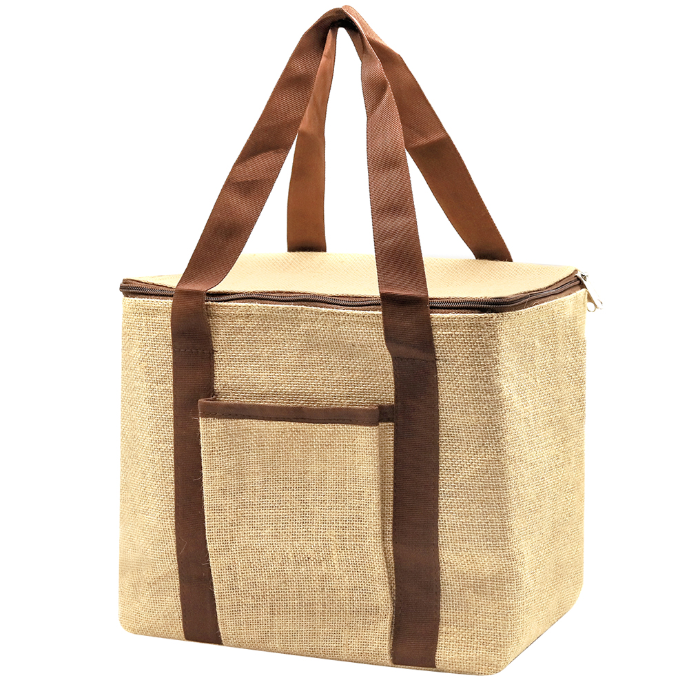 Удобная и вместительная сумка-холодильник из джута позволит взять все необходимые продукты для пикника и сохранит их свежими. Внутренняя часть имеет отделку из алюминиевой фольги, которая защищает содержимое от высоких температур. Закрывается на молнию, что еще больше улучшает изотермические характеристики. Сумка закрывается на молнию и имеет две удобные хлопковые ручки для ношения на плече или в руке. Спереди есть небольшой хлопковый карман для мелких вещей.