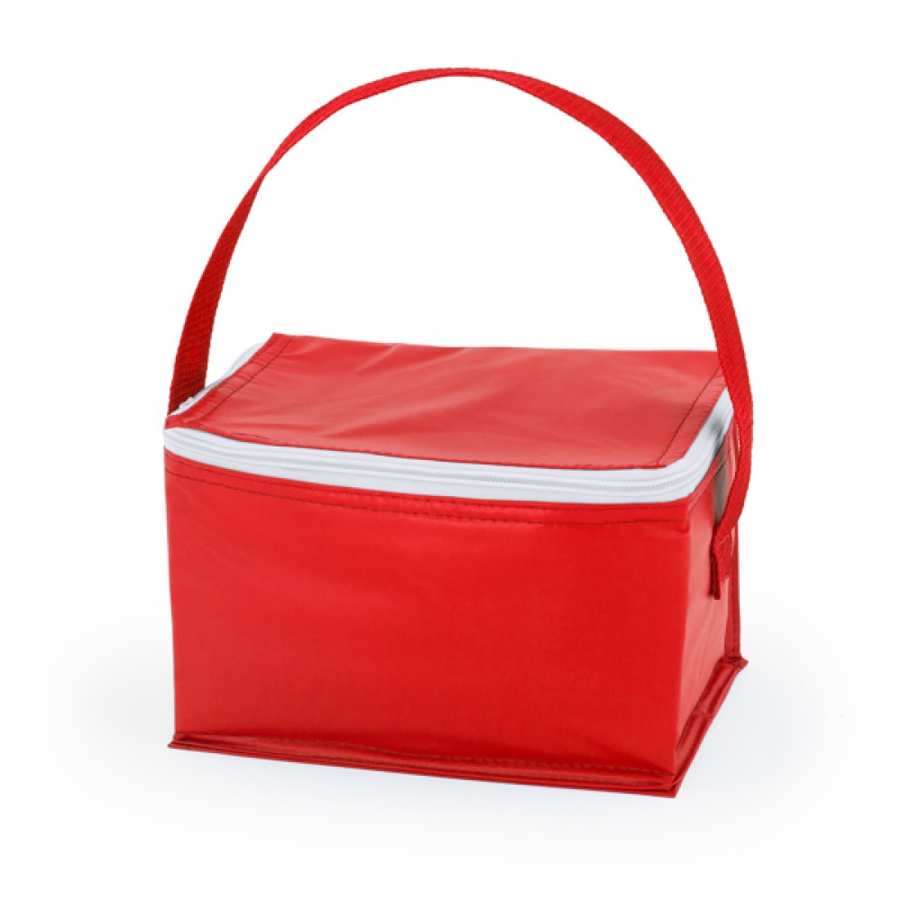 Сумка-холодильник с подкладкой из изотермического алюминия на 6 банок. Внешняя поверхность из полиэстера. Ручка для переноски и застежка-молния. Вместимость: 3 л.