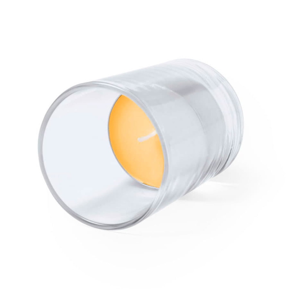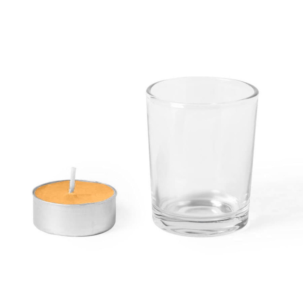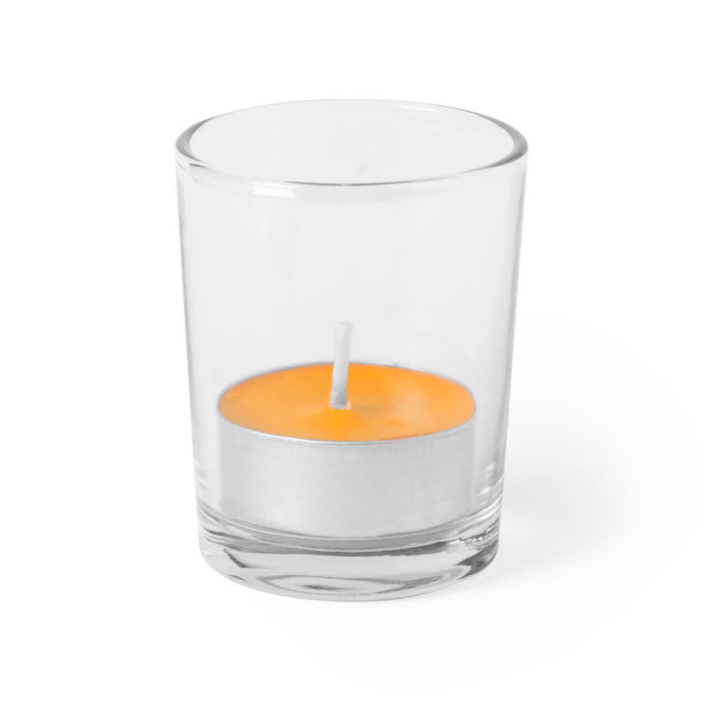 Свеча с ароматомапельсина в стеклянном стаканчике.